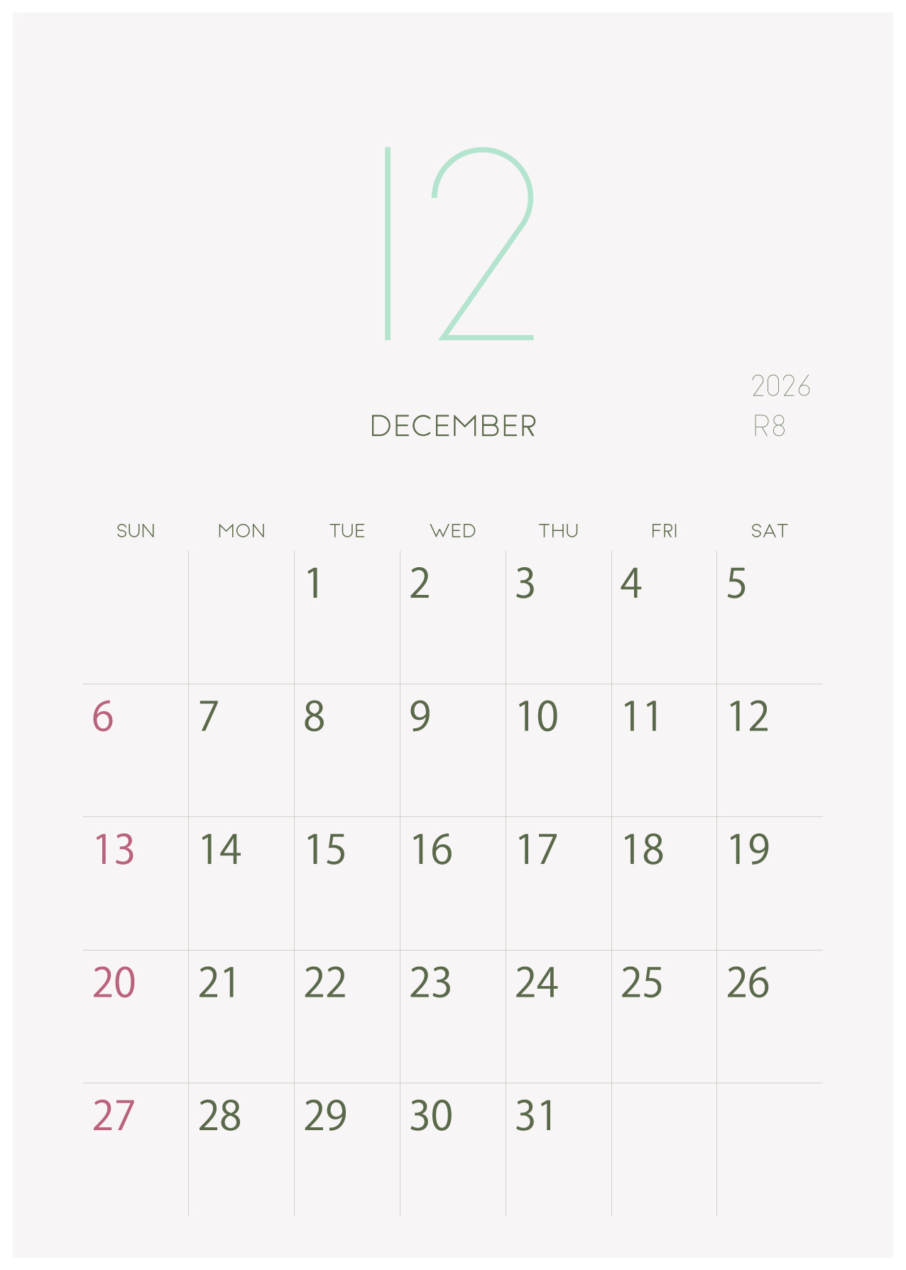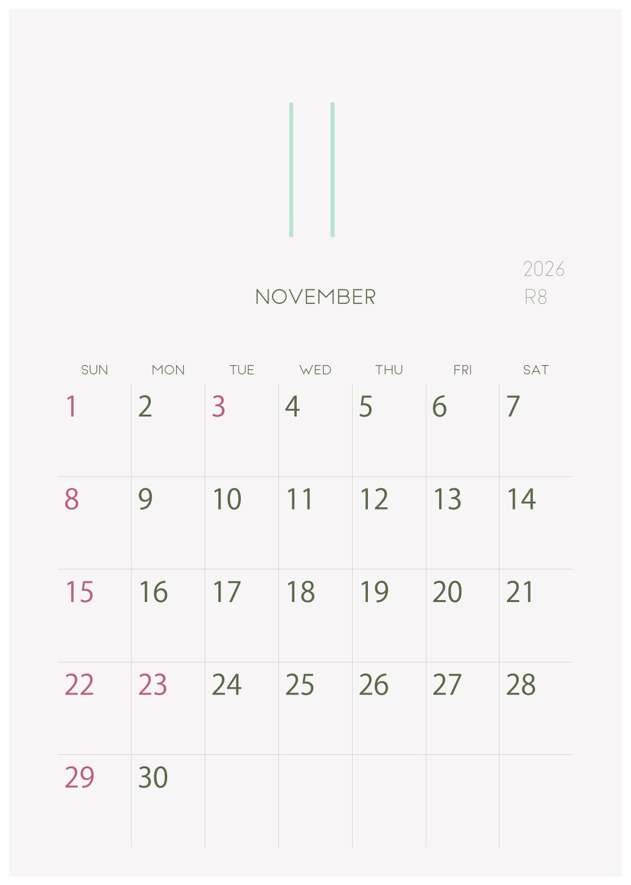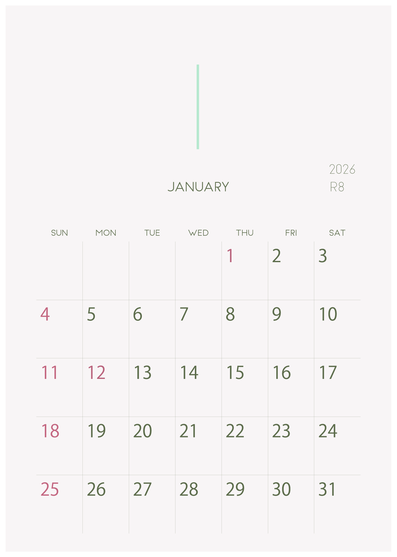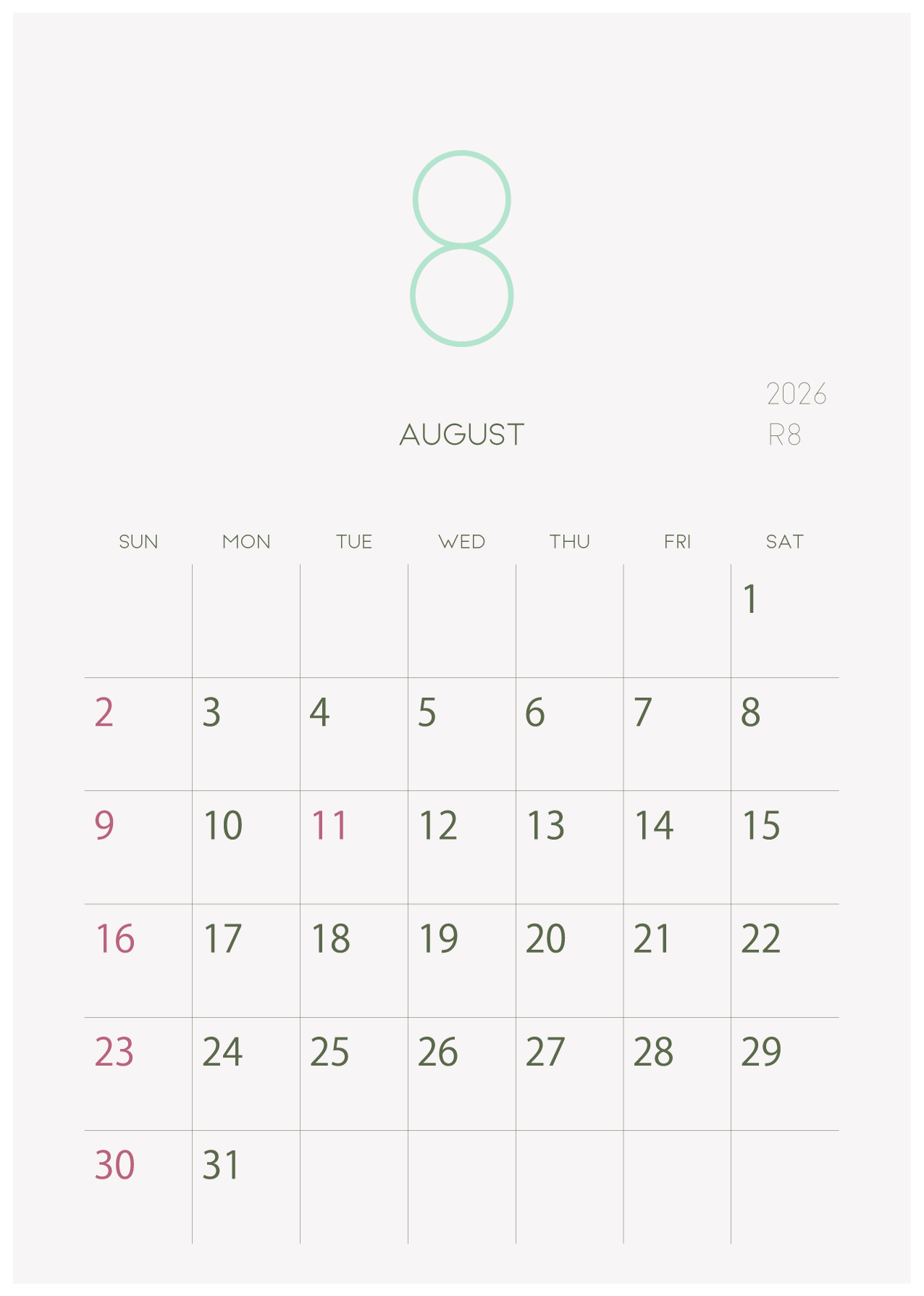 2026年令和8年の縦型カレンダー