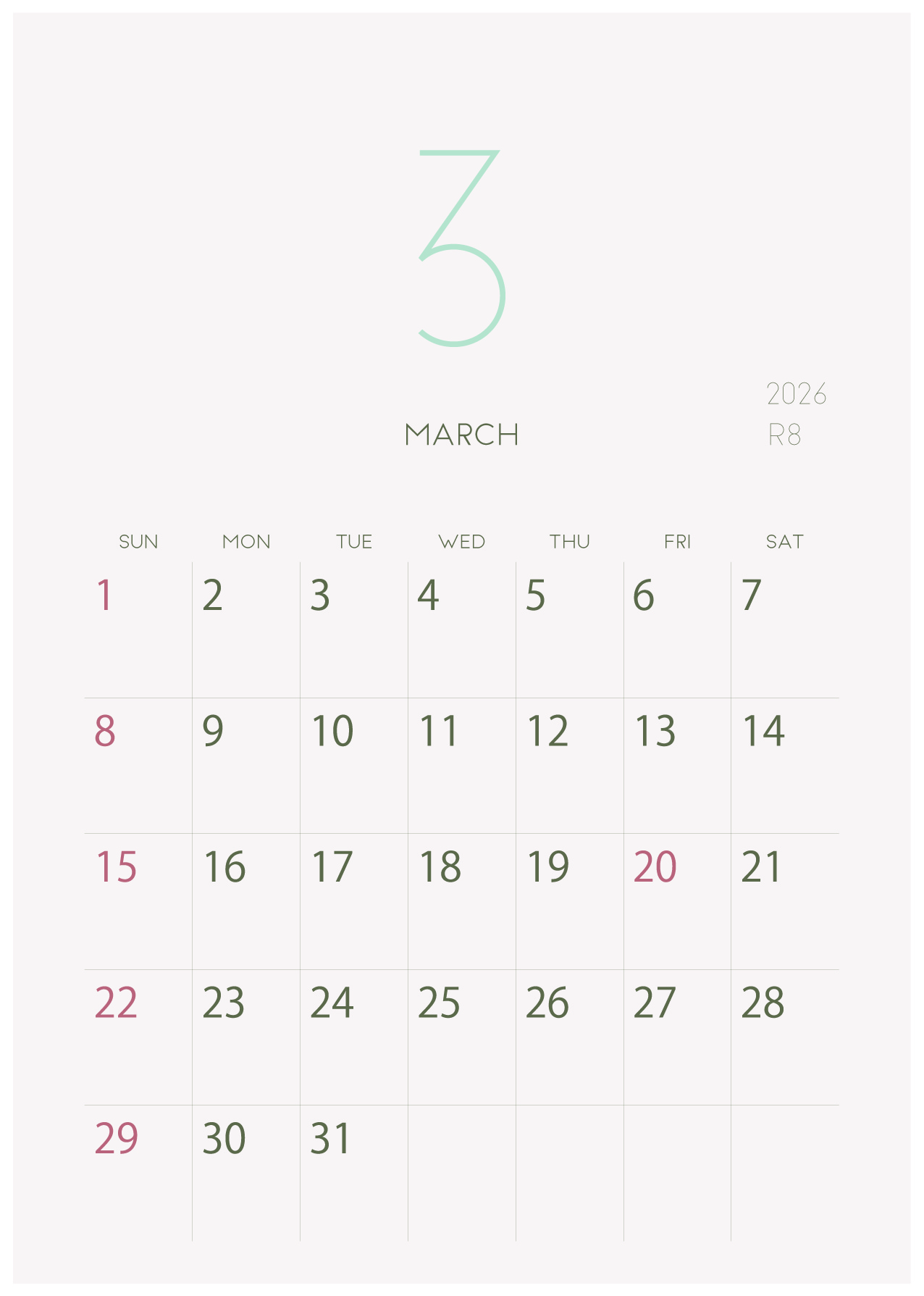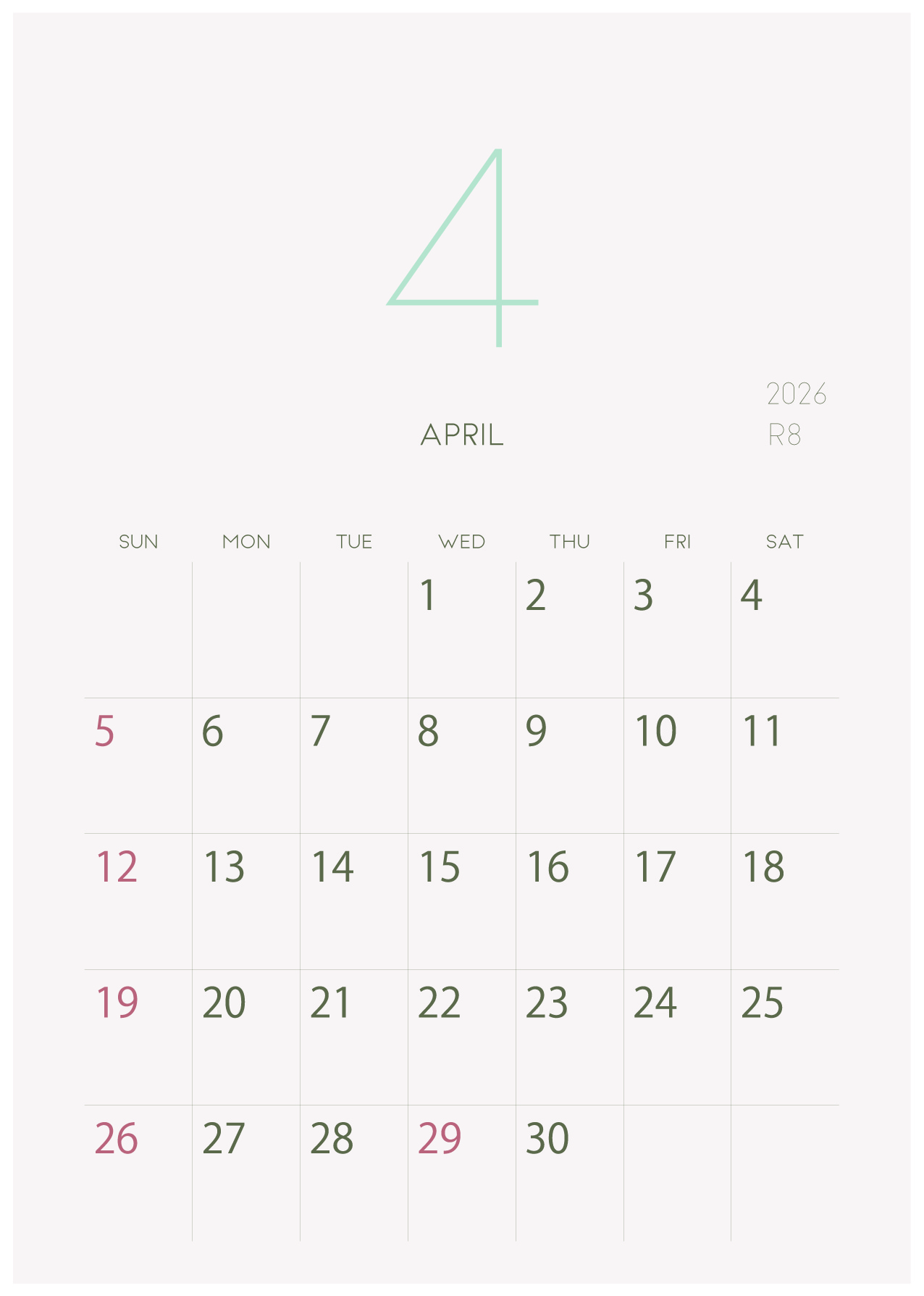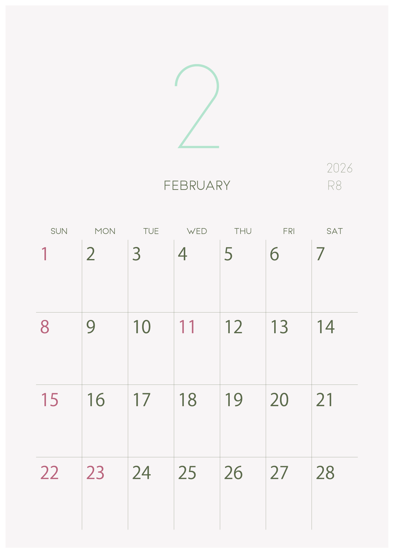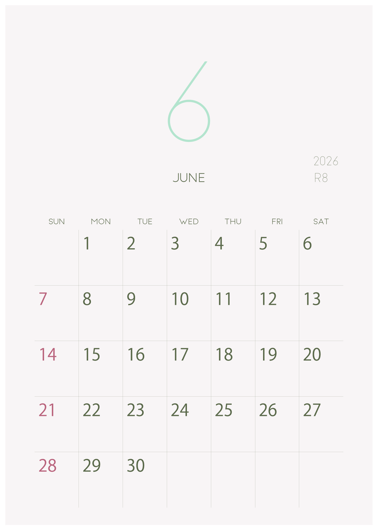背景に淡い色をつけたシンプルでおしゃれなデザインカレンダー