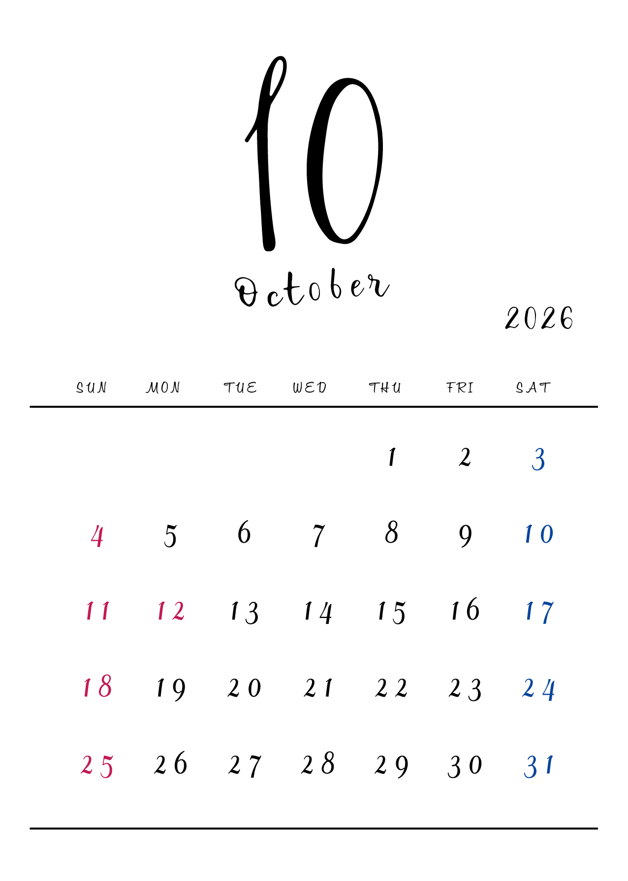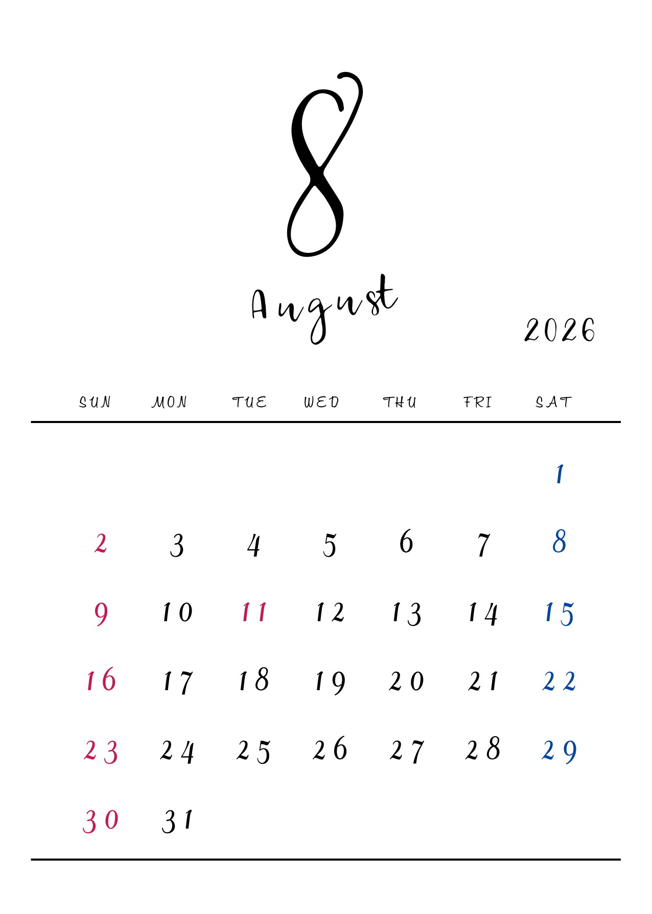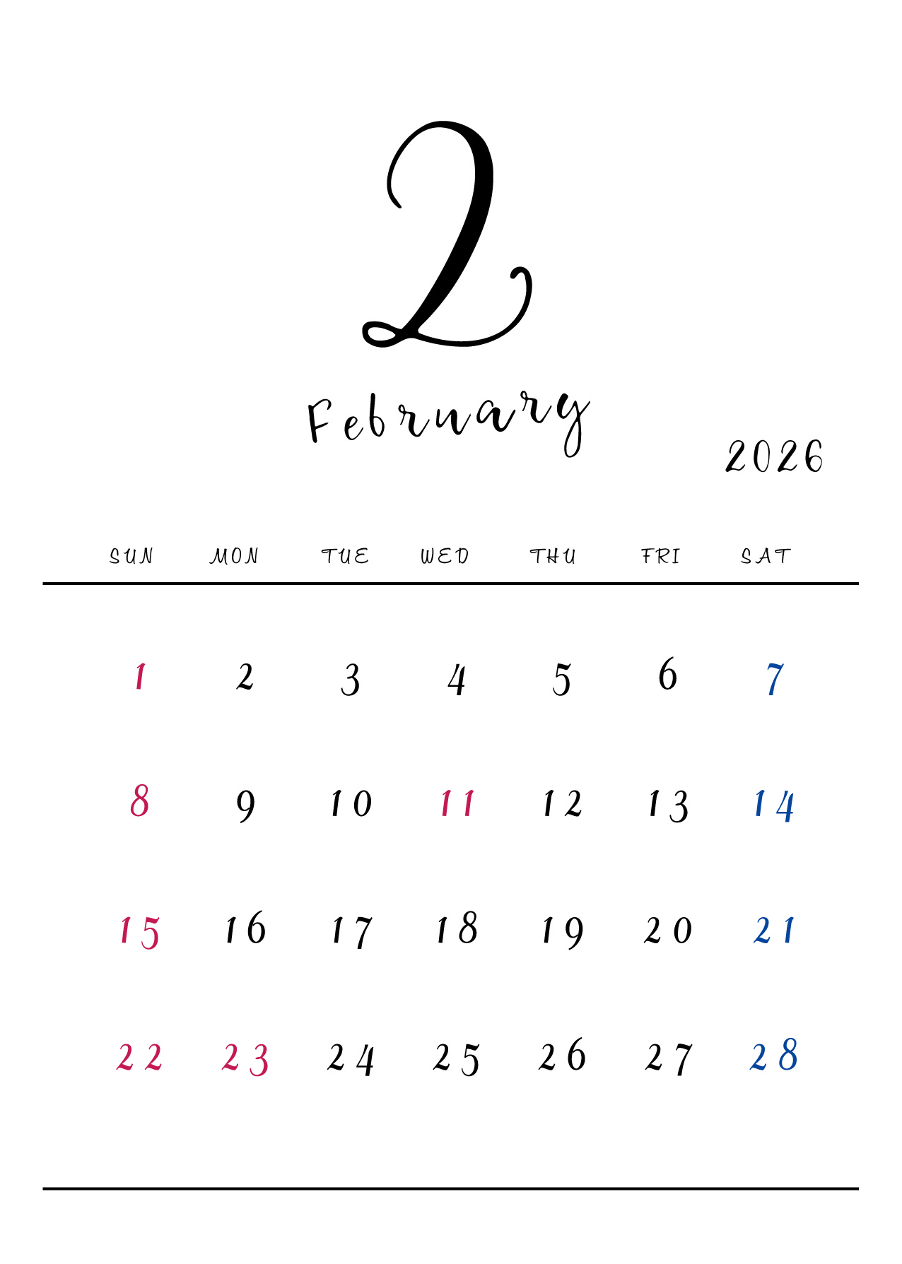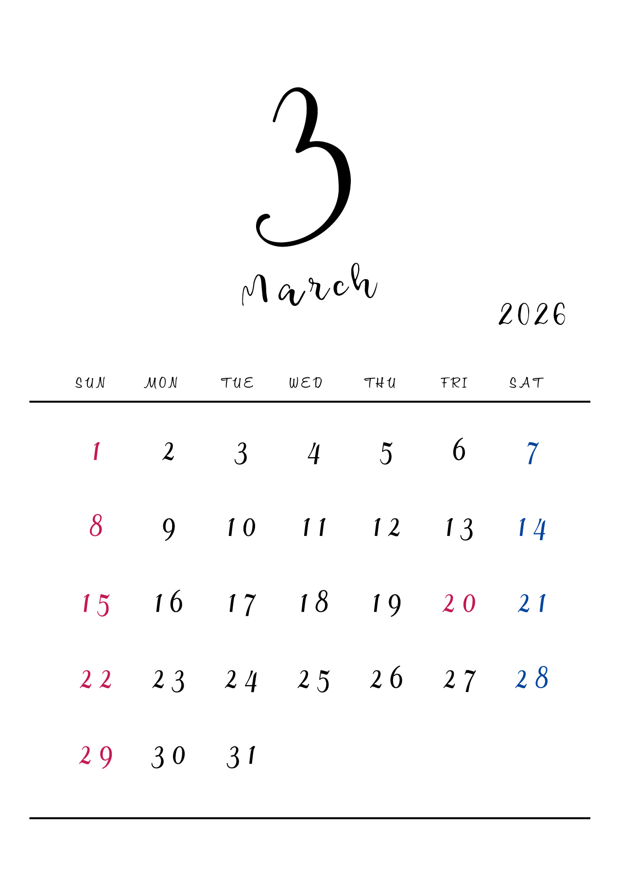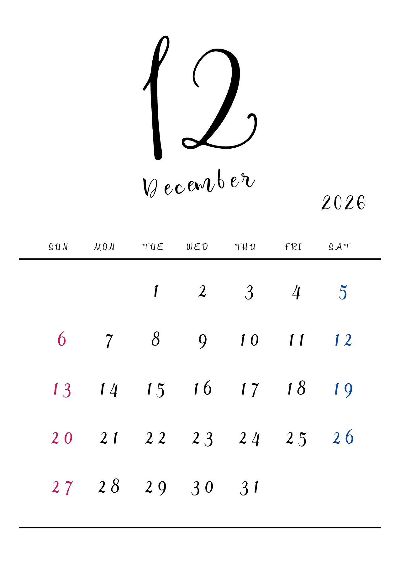 2026年(令和8年)カレンダー 縦型03 12ヶ月分
