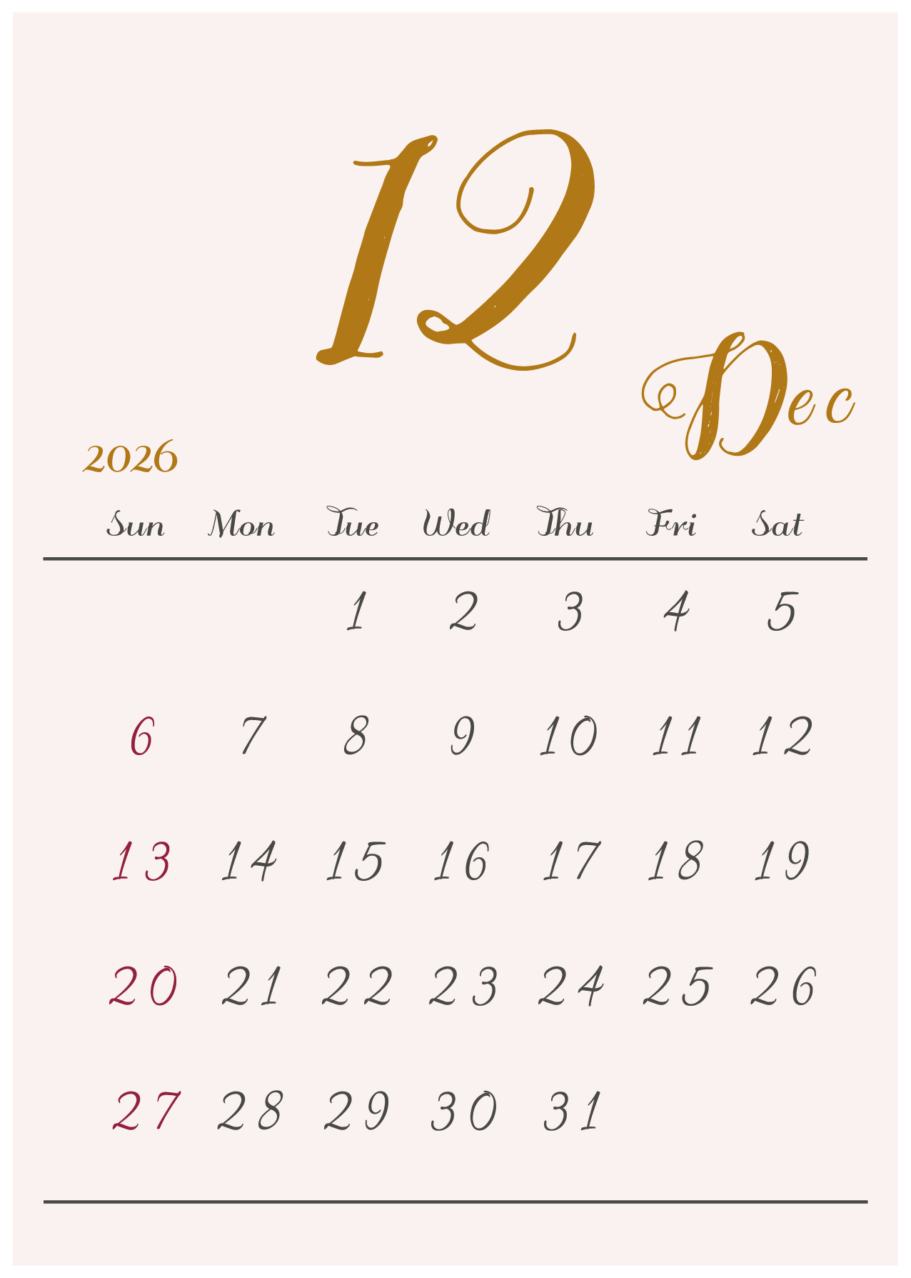 2026年(令和8年)カレンダー 縦型04-4 12ヶ月分