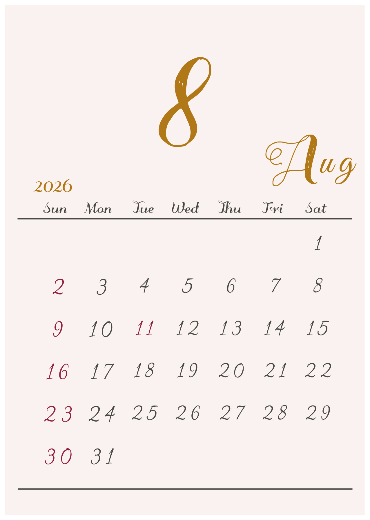 2026年令和8年の縦型カレンダー