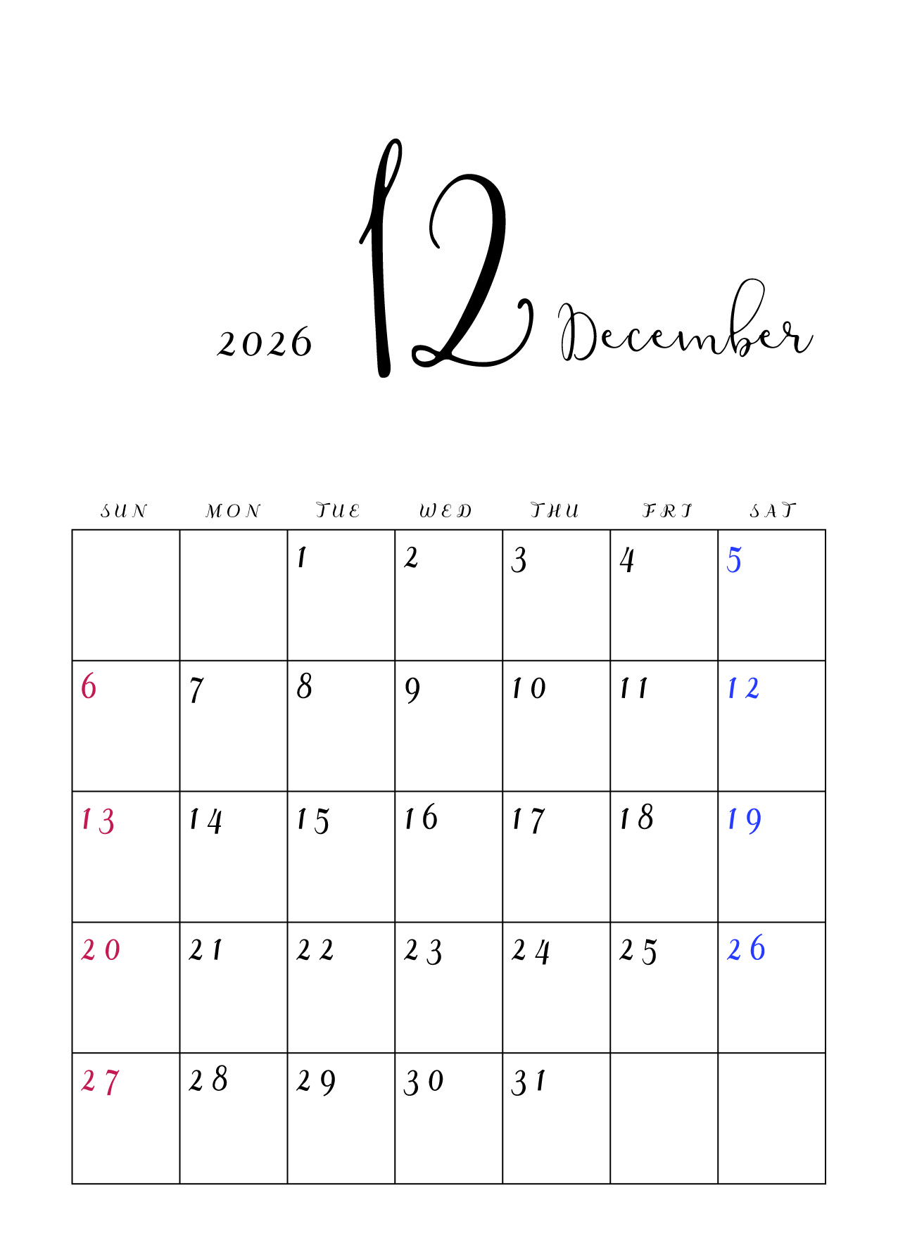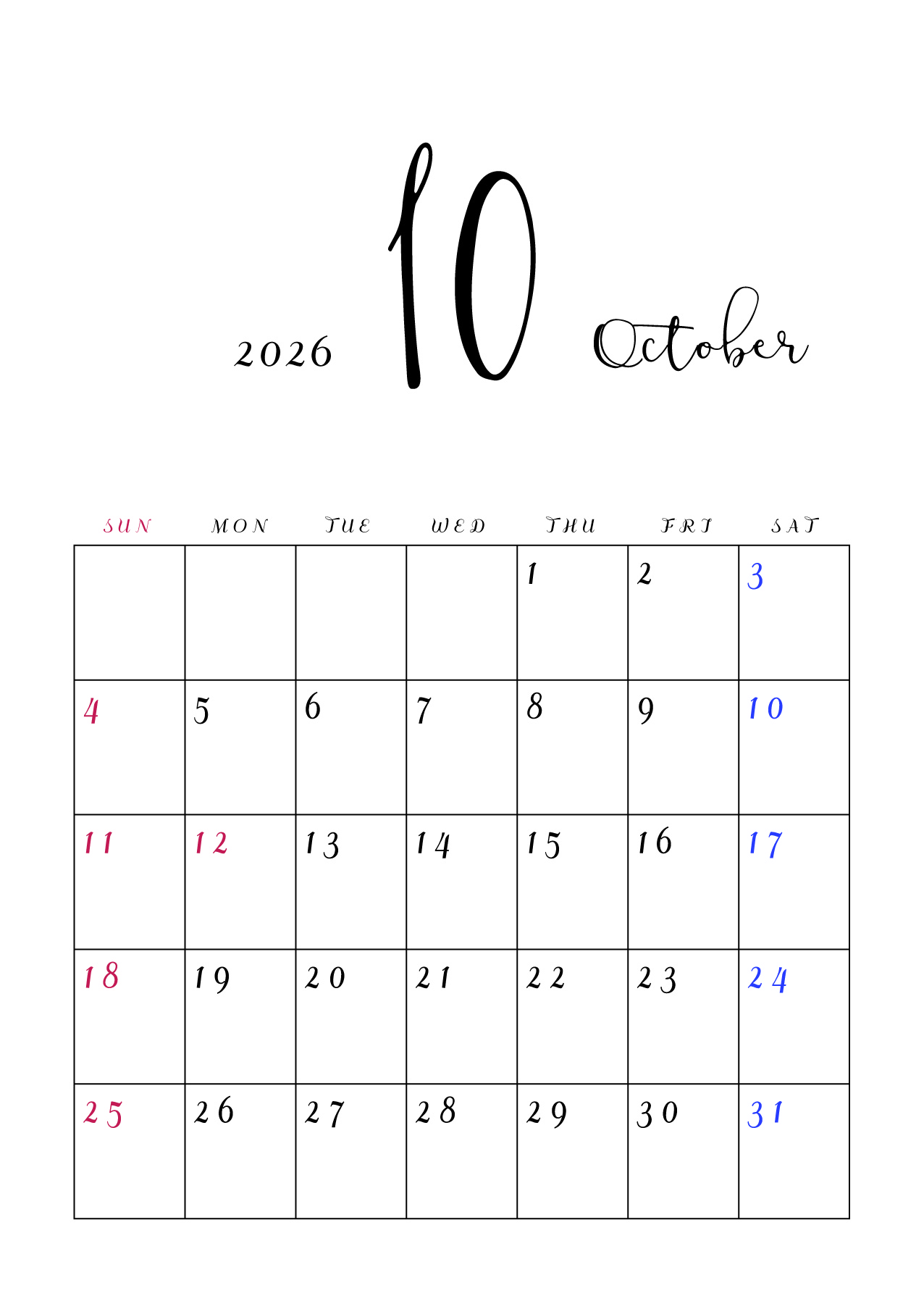2026年(令和8年)カレンダー 縦型10 12ヶ月分