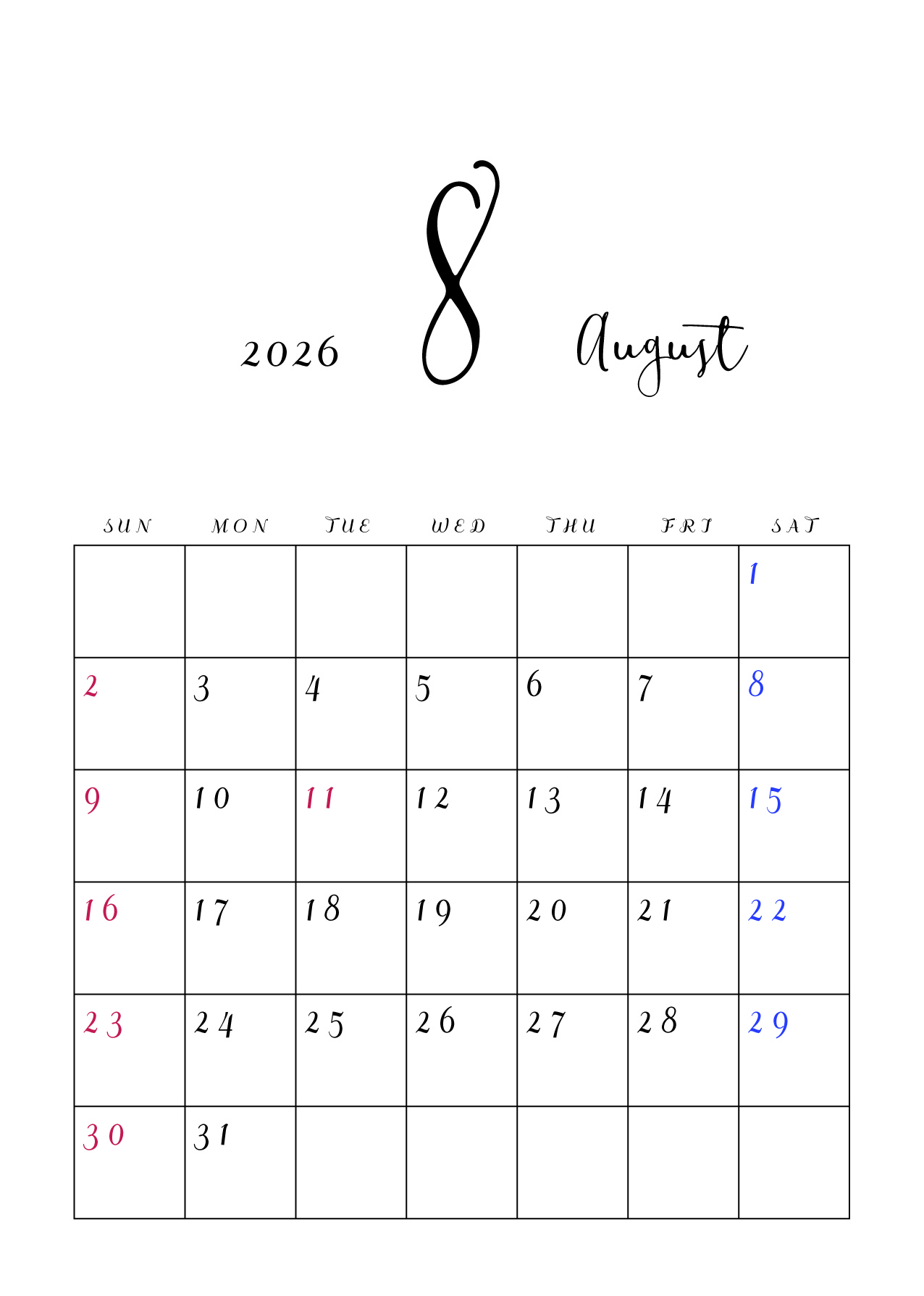 2026年令和8年の縦型カレンダー