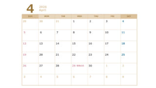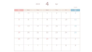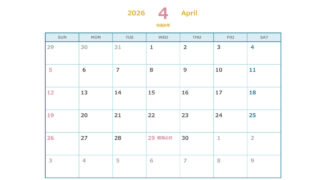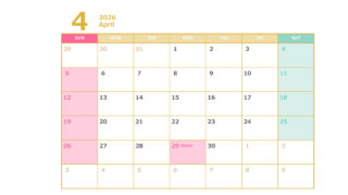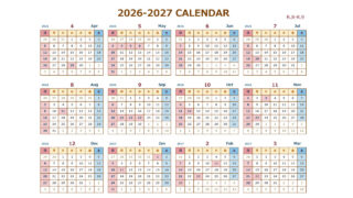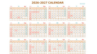無料でダウンロードできる2026年(令和8年)4月から始まる2027年(令和9年)3月までのエクセルの年間カレンダーです。シンプルでおしゃれな色合いのカレンダーになっています。商用利用無料です。自由にご利用ください。