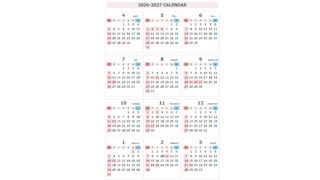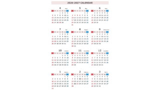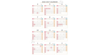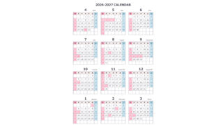 無料でダウンロードできる2026年(令和8年)4月から始まる2027年(令和9年)3月までのPDFの年間カレンダーです。シンプルでおしゃれな色合いのカレンダーになっています。商用利用無料です。自由にご利用ください。