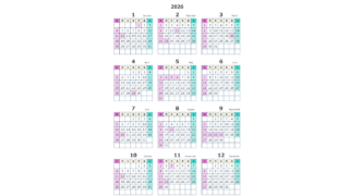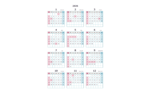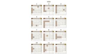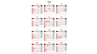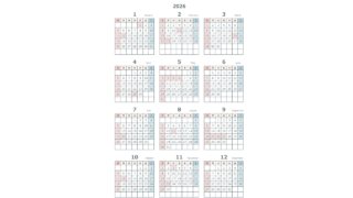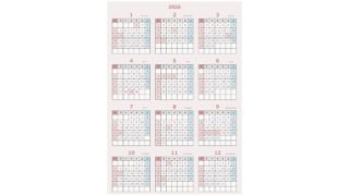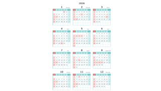 無料でダウンロードできる2026年(令和8年)PDFのカレンダーです。シンプルでおしゃれな色合いのカレンダーになっています。商用利用無料です。自由にご利用ください。