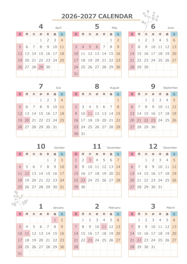 ■このエクセルカレンダーは2026年(令和8年)4月から2027年(令和9年)3月までの12ヶ月分です。