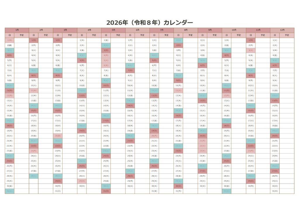 2026年1月から2026年12月までのPDF年間カレンダーです。